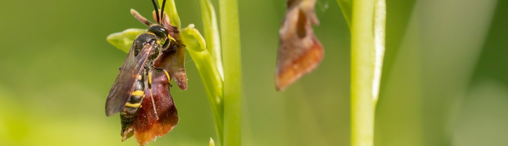 Fly orchids are in flower between May and June. At this time they attract male digger wasps (Argogorytes mystaceus) with a scent which closely resembles the female wasp’s pheromone.