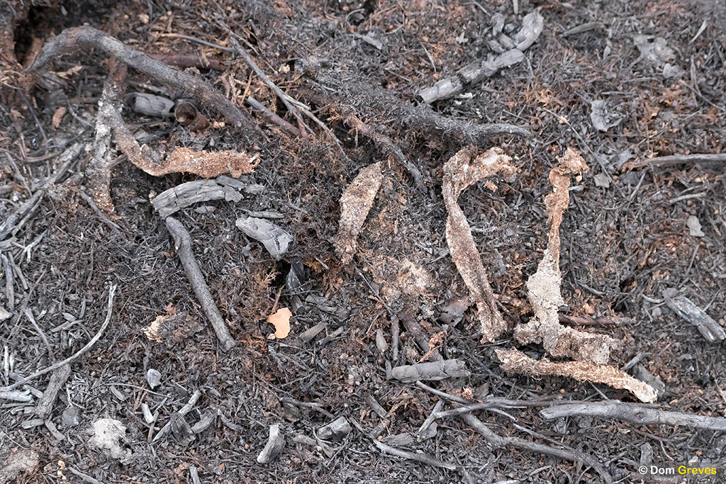 In the aftermath of heath fires, discarded sections of Purse Web tubes become more visible. Heat damages the surface layer of camouflage, exposing brighter silk beneath.